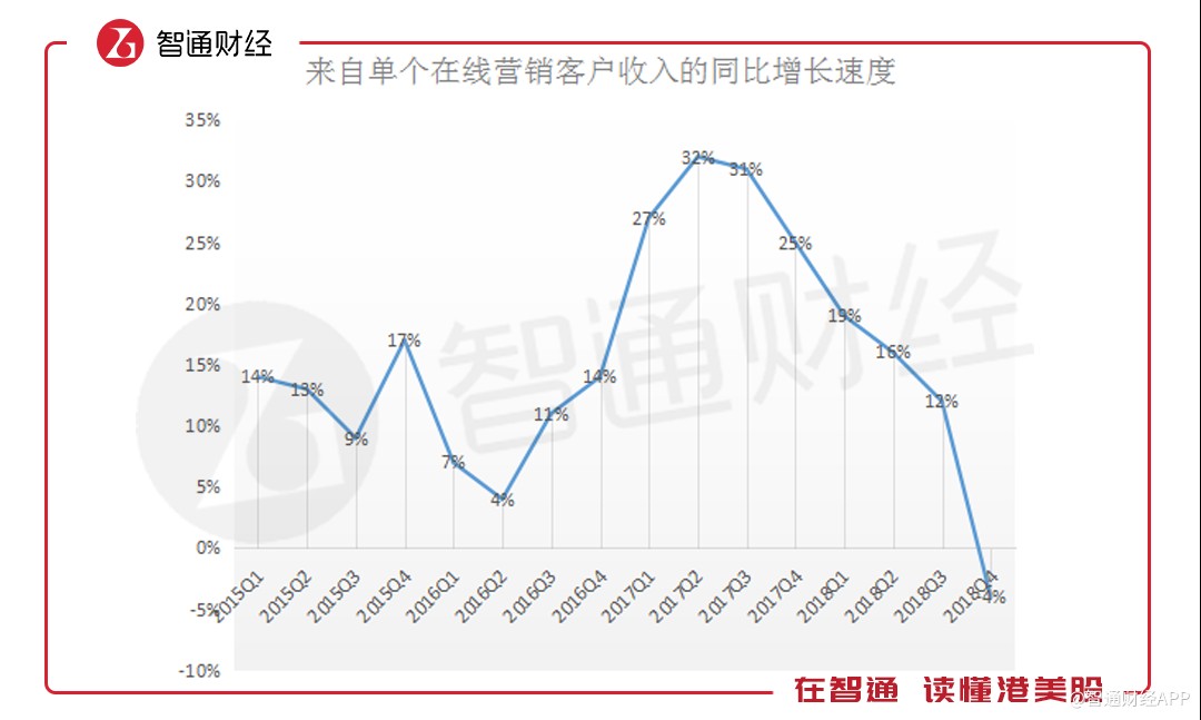 在連續(xù)下滑5個(gè)季度后,至2018年第四季度時(shí),單個(gè)在線營銷客戶收入同比下滑4%,是2015年以來的首次負(fù)增長。而四季度在線廣告收入同比增長10%主要是因?yàn)樵诰€營銷客戶數(shù)量的增加。財(cái)報(bào)中表示,第四季度時(shí),公司的在線營銷客戶為52.9萬名,同比增長15%。