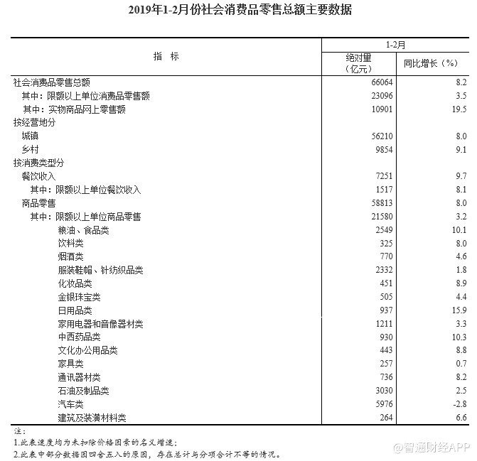 智通財(cái)經(jīng)APP獲悉,國家統(tǒng)計(jì)局公布,2019年1-2月份,社會(huì)消費(fèi)品零售總額66064億元,同比名義增長(zhǎng)8.2%,符合預(yù)期,但低于前值增長(zhǎng)9%。其中,限額以上單位消費(fèi)品零售額23096億元,增長(zhǎng)3.5%。