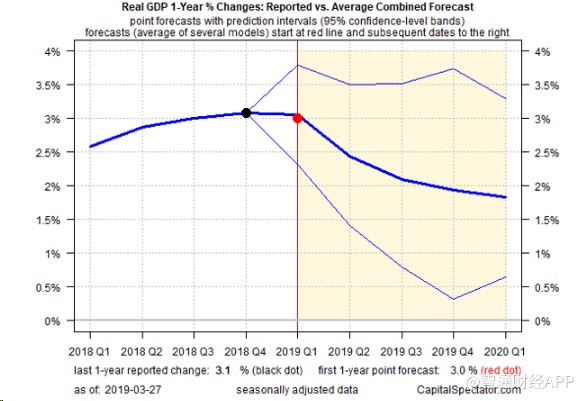 每季度更新的GDP同比數(shù)據(jù)趨勢(shì)也表明,美國經(jīng)濟(jì)出現(xiàn)下滑?!顿Y本觀察家》通過一系列綜合預(yù)測(cè)得出的平均預(yù)測(cè)值顯示,今年第一季度的同比增幅將從去年第四季度的3.1%小幅降至3.0%,并在未來幾個(gè)季度繼續(xù)走軟。如果預(yù)測(cè)無誤,這一同比增幅將出現(xiàn)自2016年第二季度以來的首次下降。