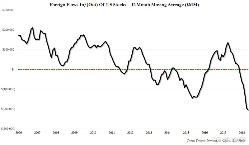 根據(jù)TIC數(shù)據(jù)顯示,外國投資者連續(xù)第10個(gè)月和過去13個(gè)月中的12個(gè)月賣出美國股票,創(chuàng)歷史新高: