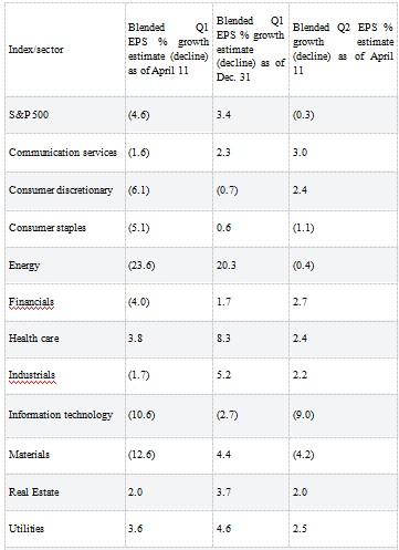 截至上周三下午,標(biāo)準(zhǔn)普爾500指數(shù)成份股的505家企業(yè)中有25家公布了業(yè)績,綜合增長預(yù)期為-4.6%,11個(gè)行業(yè)中有8個(gè)預(yù)計(jì)每股收益將同比下降。這大大低于截至12月31日預(yù)計(jì)的增幅(3.0%)。