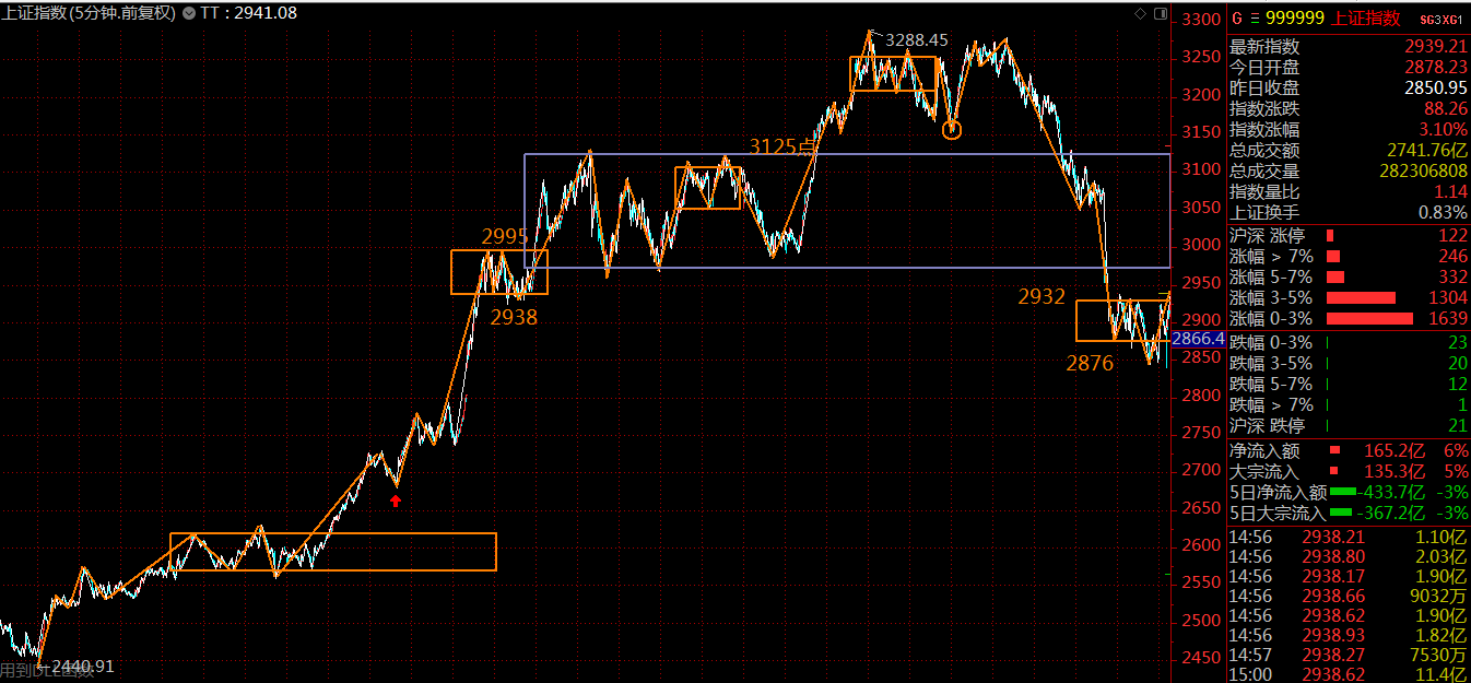 再看5分鐘級(jí)別走勢(shì)結(jié)構(gòu),在特朗普的幫助下,這里直接跌穿了三月份構(gòu)建的三十分鐘級(jí)別中樞,力度較大。周五逆轉(zhuǎn)趨勢(shì)后,在三十分鐘中樞下面,完成了這段下跌趨勢(shì)第二個(gè)五分鐘中樞的構(gòu)建工作。大概率宣告了這段五分鐘下跌趨勢(shì)的終結(jié)。下周一、周二,上證指數(shù)面臨了上方30分鐘中樞下軌2968點(diǎn)的反壓,可能會(huì)出現(xiàn)回落,投資者可逢低吸納。