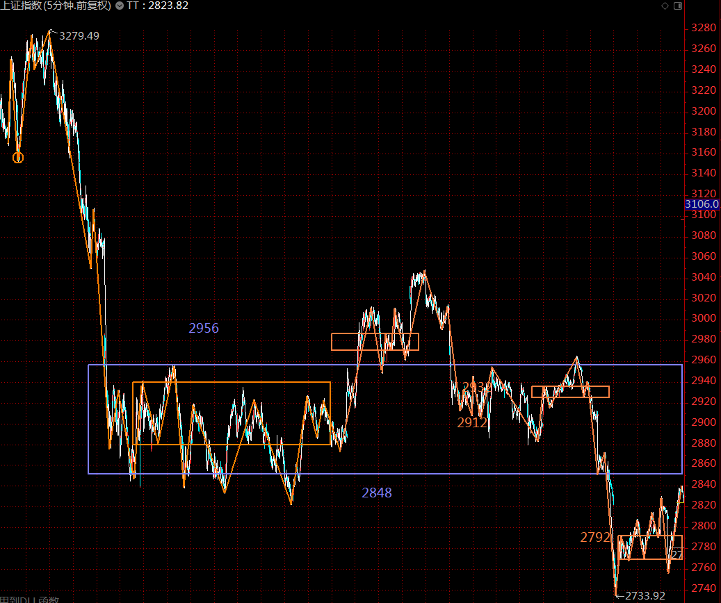 上周市場整體都處在構(gòu)建第三類賣點(diǎn)的階段,周五的高點(diǎn)2840目前初步確認(rèn)為第三類賣點(diǎn)的精確位置,如果就此轉(zhuǎn)下,下一步2792點(diǎn)就顯得尤為重要,如果往下的五分鐘線段未能跌破2792點(diǎn),那這個位置是一個合理的建倉點(diǎn),等同于針對下方三十分鐘中樞(九段擴(kuò)張)的第三類買點(diǎn)。
