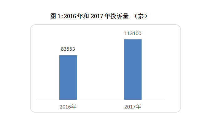 公共設(shè)施服務(wù)投訴21508宗,同比2016年的1101宗增長超過18倍,投訴量的增長主要來自于小鳴單車、小藍單車等共享單車投訴。