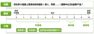 NPS計算模式:?請用戶回答“您在多大程度上愿意向您的朋友(親人、同事……)推薦XX公司/產(chǎn)品?”根據(jù)用戶的推薦意愿,將用戶分為三類:推薦者(得分在9-10之間)、被動者(得分在7-8之間)、貶損者(得分在0-6之間)。?推薦者與貶損者是對企業(yè)實(shí)際的產(chǎn)品口碑有影響的用戶,推薦者與貶損者用戶在用戶總數(shù)中所占百分比之差,即凈推薦值,如右圖所示。?據(jù)相關(guān)調(diào)查顯示,大部分公司的NPS值在5-10之間。