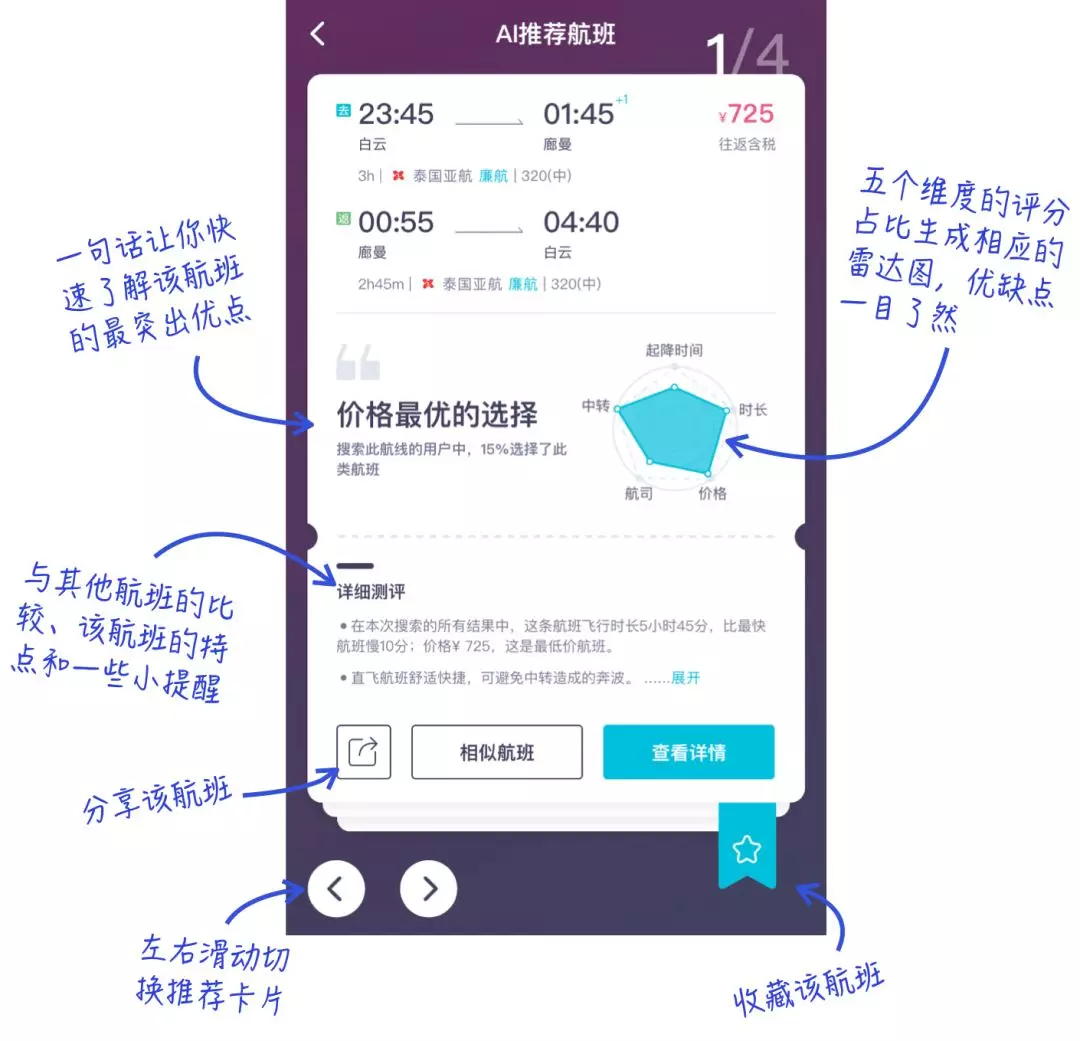 iGola通過AI技術(shù)將傳統(tǒng)的機票搜索頁面中,數(shù)十條的結(jié)果優(yōu)選為5條,通過測試,5條搜索結(jié)果可以基本cover用戶95%的選擇可能。將價格時長航司中轉(zhuǎn)起降時間,設(shè)置為5個維度,以五星維度圖的形式對相關(guān)航旅方案進行直觀的評價,并給出明顯的文字提示,闡明航旅方案亮點。定制內(nèi)容-千人千面,不同需求的乘客(重視價格、重視服務(wù)),會得到不同的搜索結(jié)果。UI設(shè)計與傳統(tǒng)的OTA搜索界面有巨大差異,操作極簡,深受年輕用戶喜歡。