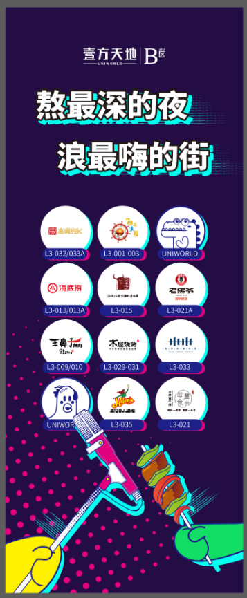 購(gòu)物中心是城市的精華,也是生活方式的容器。B區(qū)洞察了當(dāng)代年輕人的這一消費(fèi)習(xí)慣,發(fā)力“夜經(jīng)濟(jì)”,精心打造夜市街區(qū)——嗨FUN宵夜街。