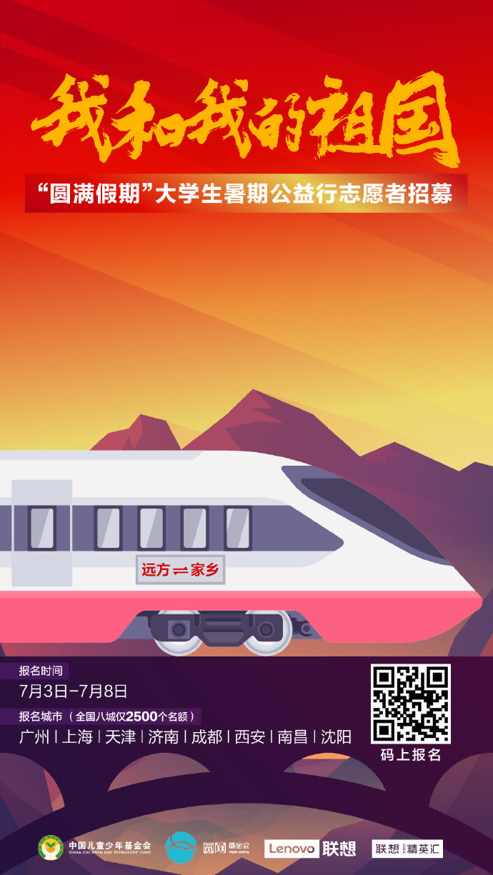 7月3日,由中國(guó)兒童少年基金會(huì)、北京圓網(wǎng)慈善基金會(huì)和聯(lián)想集團(tuán)共同發(fā)起的“‘我和我的祖國(guó)’圓計(jì)劃—圓滿(mǎn)假期大學(xué)生暑期公益行”活動(dòng),面向全國(guó)8個(gè)城市的大學(xué)生正式開(kāi)啟志愿者招募,邀請(qǐng)回鄉(xiāng)大學(xué)生加入到為廣大留守兒童群體量身定制的公益行動(dòng)中,幫孩子團(tuán)圓、為孩子圓夢(mèng)、讓愛(ài)心圓滿(mǎn)。對(duì)于大學(xué)生來(lái)說(shuō),這將是一次獨(dú)特的公益實(shí)踐經(jīng)歷。