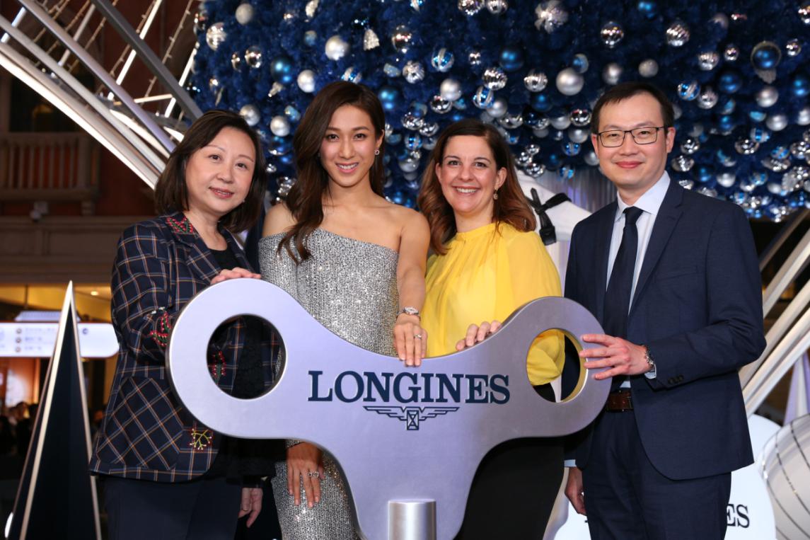 (左起)浪琴澳門副總裁鄭美齡、影視明星鐘嘉欣、金沙中國(guó)有限公司零售市場(chǎng)推廣副總裁Rita Simonetta及金沙中國(guó)有限公司商場(chǎng)管理部總監(jiān)梁俊強(qiáng)一同啟動(dòng)高達(dá)13米的藍(lán)色菱形圣誕樹底部的音樂(lè)盒裝置。