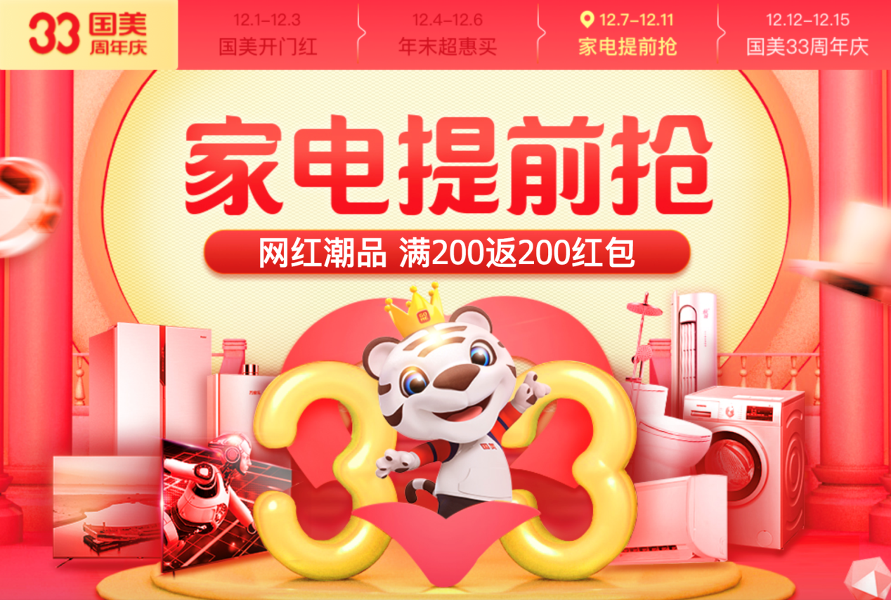 12月12日-14日,國美33周年“超級(jí)夜市”,線上商城、線下門店共赴一場(chǎng)“巔峰2小時(shí)”的盛宴。家裝、換新、添置新物件,所有的需求在國美一次滿足。