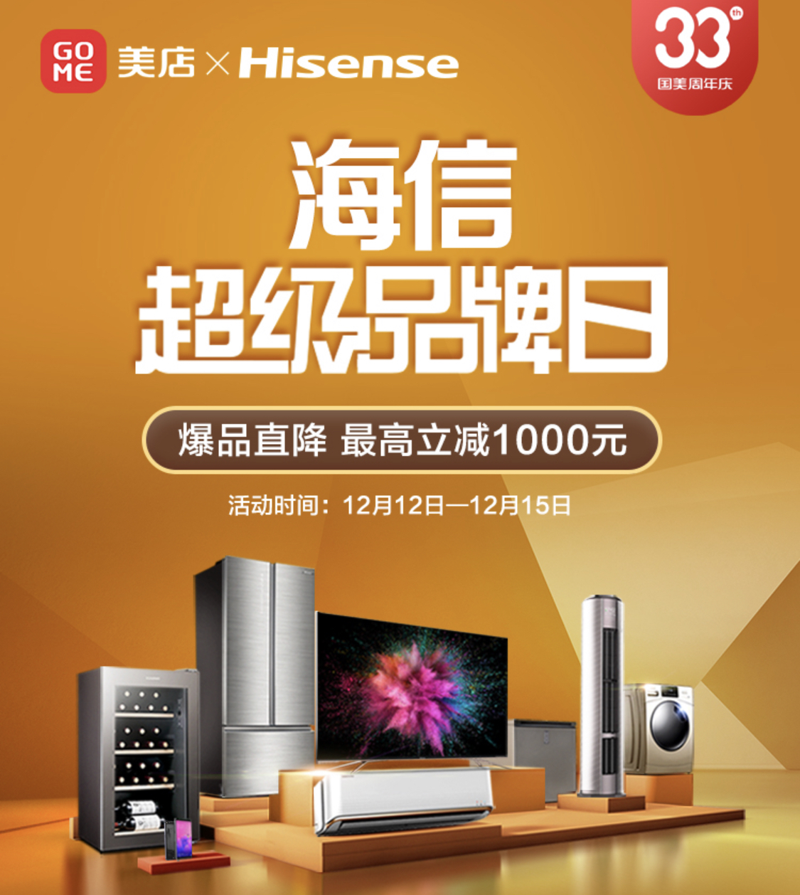 深圳新聞網(wǎng)2019年12月12日訊 12月12日-15日,國(guó)美33周年慶活動(dòng)已經(jīng)啟動(dòng),屆時(shí)消費(fèi)者可在深圳國(guó)美門店參與“全場(chǎng)好物,第二件5折起”活動(dòng)。同時(shí),海信、海爾、美的超級(jí)品牌日活動(dòng)也將于12日-15日期間在國(guó)美美店展開(kāi)。用戶在國(guó)美APP中美店活動(dòng)專區(qū)便可參與到活動(dòng)中來(lái),下面為大家介紹下本次海信超級(jí)品牌日的重磅爆品,全場(chǎng)最高立減1000元,還有機(jī)會(huì)獲得愛(ài)奇藝四端VIP會(huì)員卡和小度音箱等福利獎(jiǎng)品,不要錯(cuò)過(guò)。