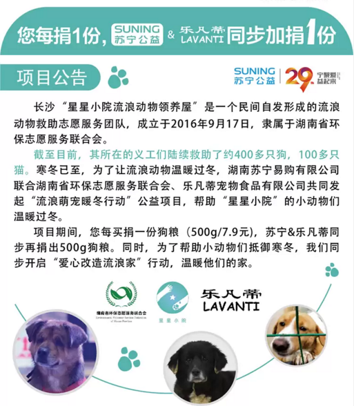 要說本次暖心活動(dòng)最受關(guān)注的,還屬蘇寧線上線下聯(lián)動(dòng)發(fā)起的“愛心狗糧7.9元捐”活動(dòng)?;顒?dòng)期間,愛心人士只需要以7.9元的折扣價(jià),在蘇寧易購線上購買一斤樂凡蒂狗糧就可完成捐贈(zèng)。同時(shí),蘇寧和樂凡蒂將加捐1斤。相當(dāng)于7.9元捐贈(zèng)兩斤狗糧。而這些愛心狗糧,將直接發(fā)往長沙“星星小院流浪動(dòng)物領(lǐng)養(yǎng)屋”。