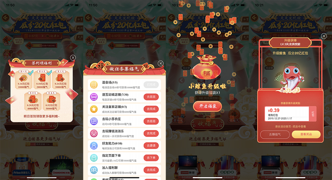 用戶通過做任務、每日簽到、逛品牌店鋪,或者訪問小蘇的農(nóng)莊、玩賺錢消消樂福利游戲均可獲得福氣值以喂養(yǎng)鯨魚,收集到的福氣值越多,福袋將變得越大,鯨魚升級也越快,可領取的紅包金額也越大。