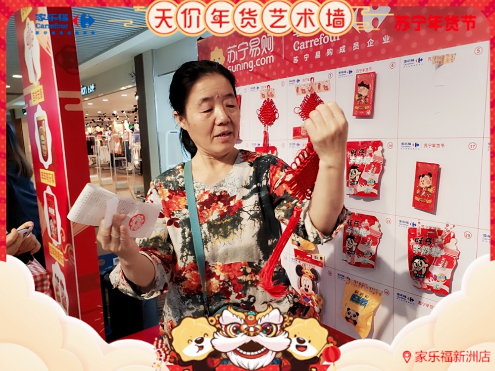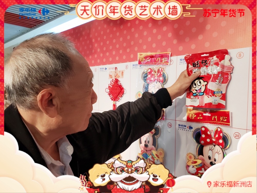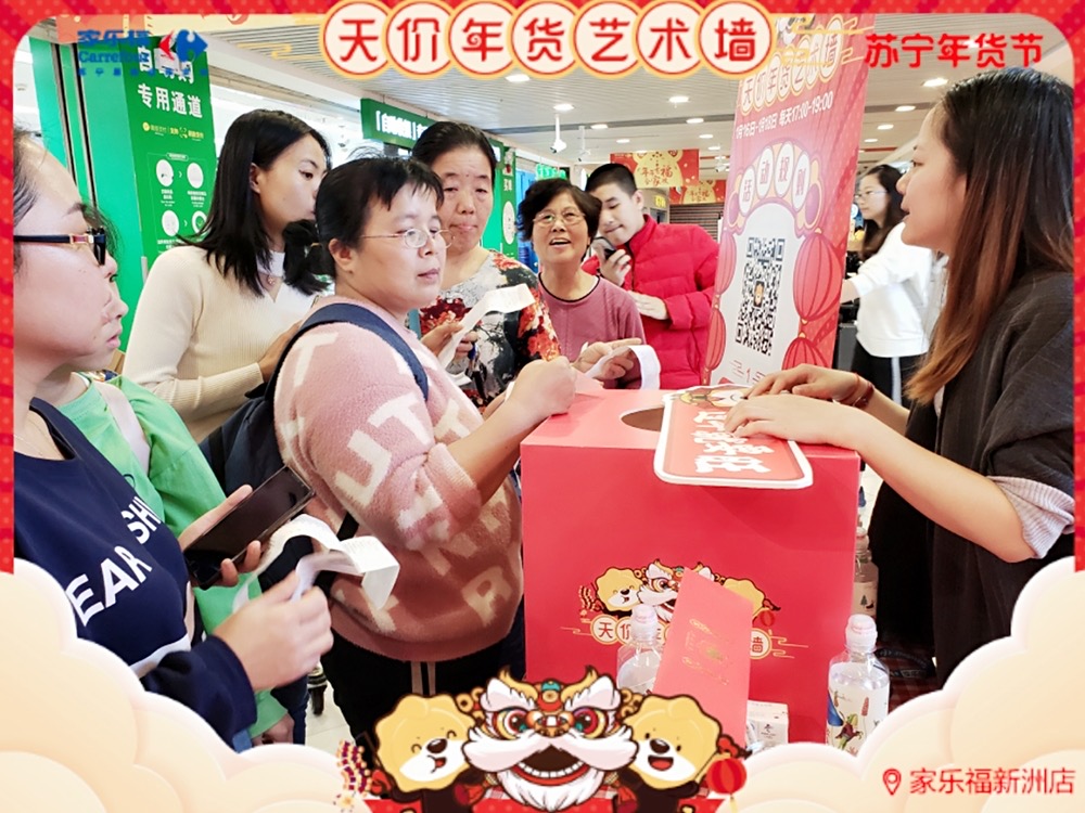 天價(jià)年貨藝術(shù)墻,藝術(shù)年貨送不停 ! 1月17日 至 1月 19 日 , 家樂福華南區(qū)廣州員村店、珠海吉大店、福州寶龍店 、廈門中華城店及 深圳新洲店 (活動時(shí)間為1.16-1.18) 活動繼續(xù) 。 禮品數(shù)量有限,每天送完即止 !蘇寧家樂福 實(shí)力助你過年味滿滿的春節(jié) ,邀請您 來把年貨驚喜領(lǐng)回家 !