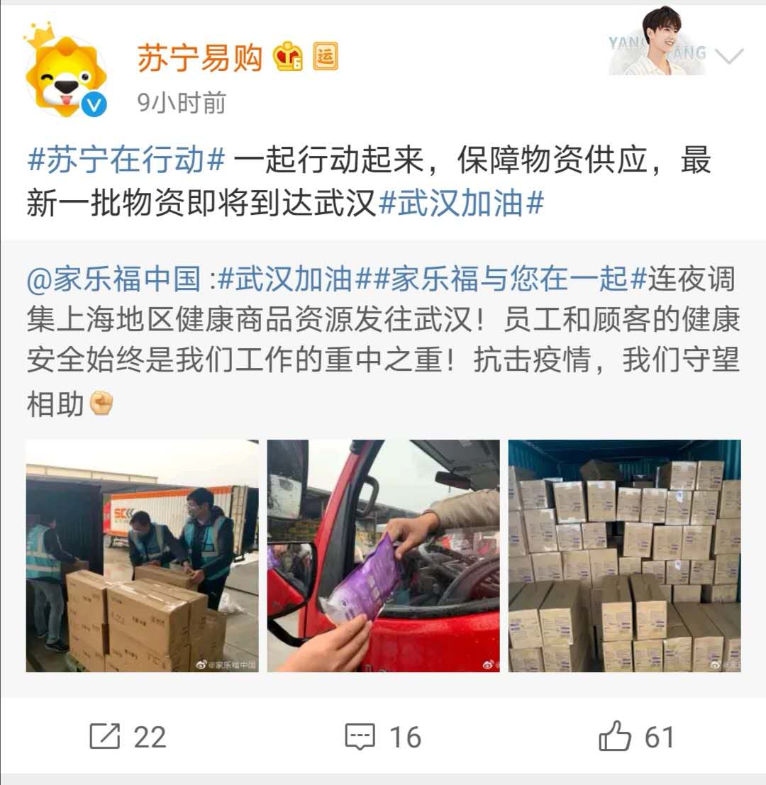 在疫情后方,不少后勤保障單位、組織也是做好了充足的準(zhǔn)備。1月23日,蘇寧旗下家樂福中國官方微博發(fā)布了一條關(guān)于 #家樂福堅決不漲價,虧錢也不能漲!#的微博表示,家樂福中國管理團隊承諾春節(jié)期間民生用品不漲價,同時針對武漢及全國范圍都提前備好充足貨量,誓與全國人民一起共渡難關(guān)。