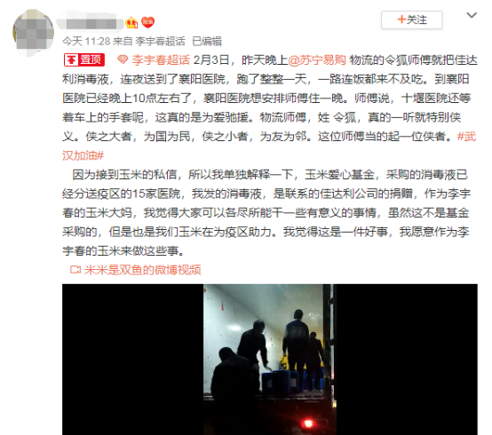這批物資中,安排消毒液的網(wǎng)友是李宇春的粉絲,他們當(dāng)晚就將令狐師傅日夜兼程的故事發(fā)布到了社交平臺。