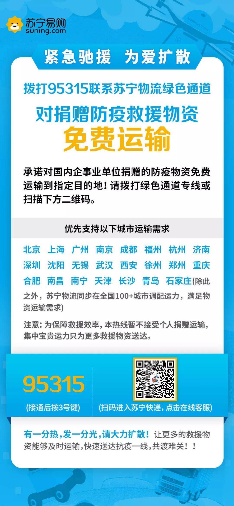 一方有難,八方支援。除夕夜的聲援只是開始。大年初一下午4點,蘇寧物流正式開通“綠色通道”,接受地方政府、公益組織等對武漢地區(qū)的援助物資運(yùn)輸需求,第一時間將援助物資配送至抗疫前線。通道一經(jīng)開通,需求立即涌入。