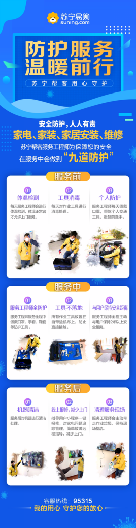 據(jù)悉,蘇寧家電“九道防護”措施涵蓋服務的前、中、后期全程。服務前,蘇寧服務工程師需進行體溫檢測,衣物工具車輛消毒,同時佩戴口罩;服務過程中,需佩戴口罩、手套、鞋套等全套防護工具,并主動與用戶保持2米的安全距離,避免直接接觸;服務完成后,對機器進行清潔處理,同時指導用戶關(guān)注報修和故障求助,帶走作業(yè)垃圾。