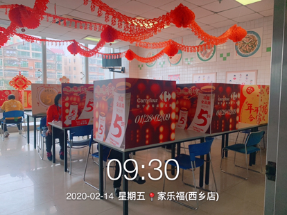 蘇寧家樂福還安排了保潔員每天對員工餐廳按三餐進(jìn)行清潔,使用稀釋的84消毒液浸泡抹布對桌椅進(jìn)行擦拭。其次,在餐廳放置免洗消毒凝膠,供員工用餐前清潔使用。再次,要求員工分時(shí)段用餐,自帶餐盒餐具盛飯;每個(gè)人在餐廳內(nèi)用餐是也要與他人保持一定距離,并用簡易卡板隔開。