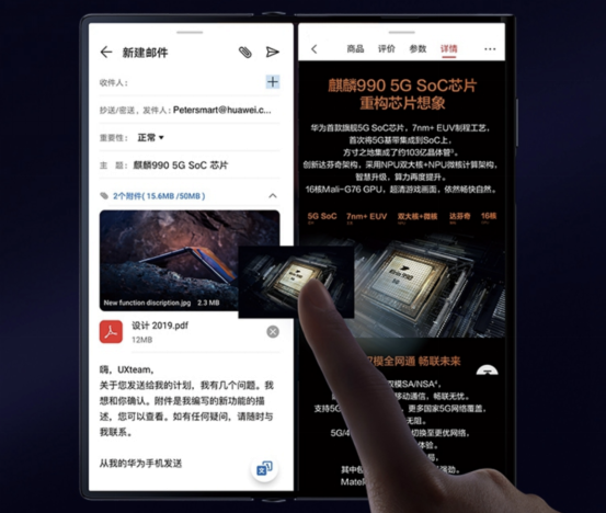 Mate Xs采用8英寸顯示屏,分辨率為2480×2200,折疊時(shí),屏幕尺寸為6.6英寸,分辨率為2480×1440。展開狀態(tài)下,華為Mate Xs充分發(fā)揮突破視野的視覺空間優(yōu)勢,在瀏覽視頻、開啟閱讀、使用導(dǎo)航以及游戲影音時(shí),將獲得前所未有的視覺極限與沉浸體驗(yàn)。此外,通過智慧分屏模式,可以同時(shí)顯示、運(yùn)行多個(gè)應(yīng)用程序,多窗口交互提升應(yīng)用體驗(yàn)及操作效率。這種智慧分屏模式提供平行視界、跨屏拖拽、懸浮窗、分屏快捷欄等高頻使用場景智慧生態(tài)操作。
