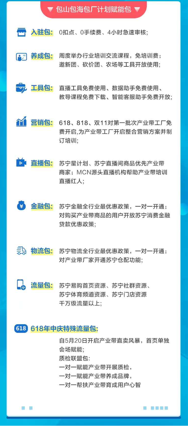 為了扶助產(chǎn)業(yè)帶商戶快速成長(zhǎng),蘇寧拼購(gòu)發(fā)布了“包山包海包廠”賦能包,從物流、金融、營(yíng)銷、直播、工具等多個(gè)角度扶助產(chǎn)業(yè)帶商戶。