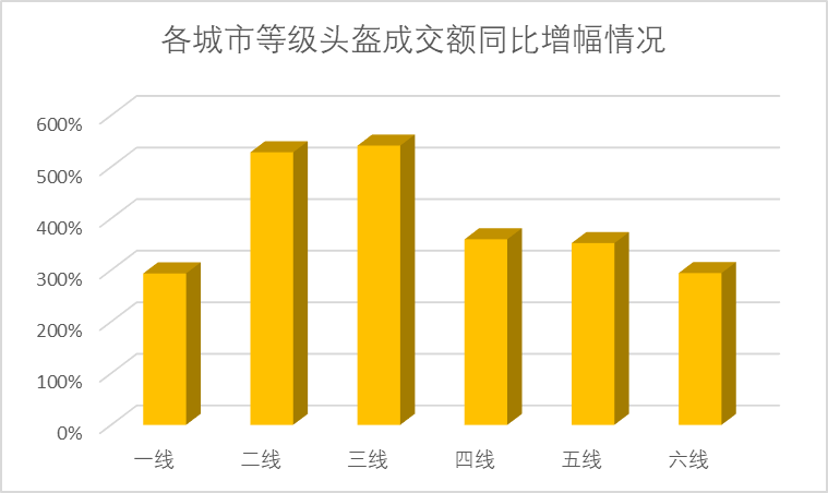 京東大數(shù)據(jù)顯示,5月以來,摩托車及電動車頭盔受到消費者的廣泛關注,不僅搜索量達到了去年同期的8倍,成交額同比增幅也接近400%。其中,江蘇、河南、天津、云南地區(qū)頭盔的成交額都達到去年同期的10倍以上,上海、河北、寧夏、安徽地區(qū)頭盔的成交額達去年同期的8倍以上,廣東省成交額同比增幅125%。從各城市等級的頭盔消費數(shù)據(jù)來看,二線及三線市場增速更為明顯。