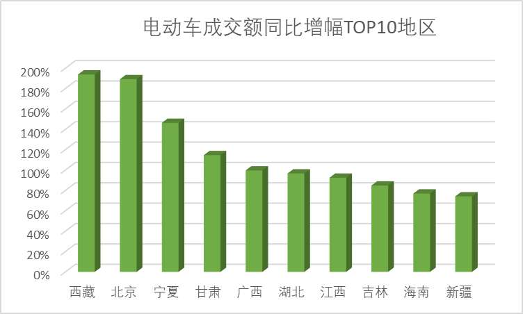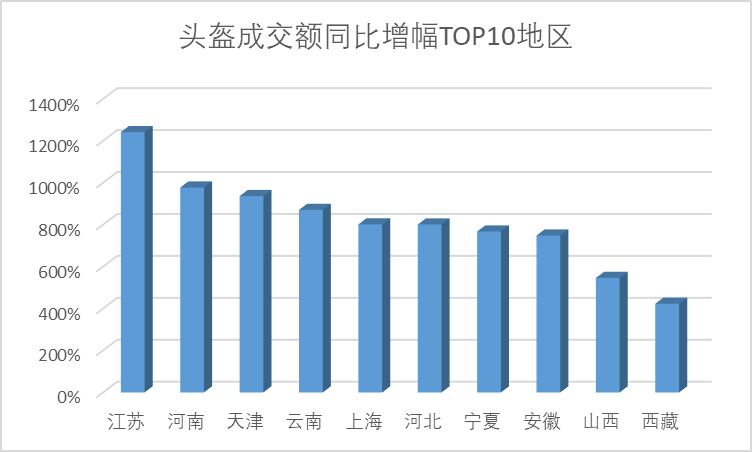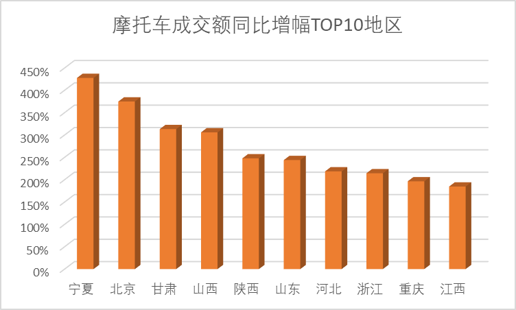 頭盔取得高速增長的同時,摩托車、電動車的成交額增幅也分別超過110%和50%。寧夏、北京、甘肅、陜西等地區(qū)摩托車成交額同比增幅較高,而西藏、北京、寧夏、甘肅等地區(qū)的電動車成交額同比增幅較高。