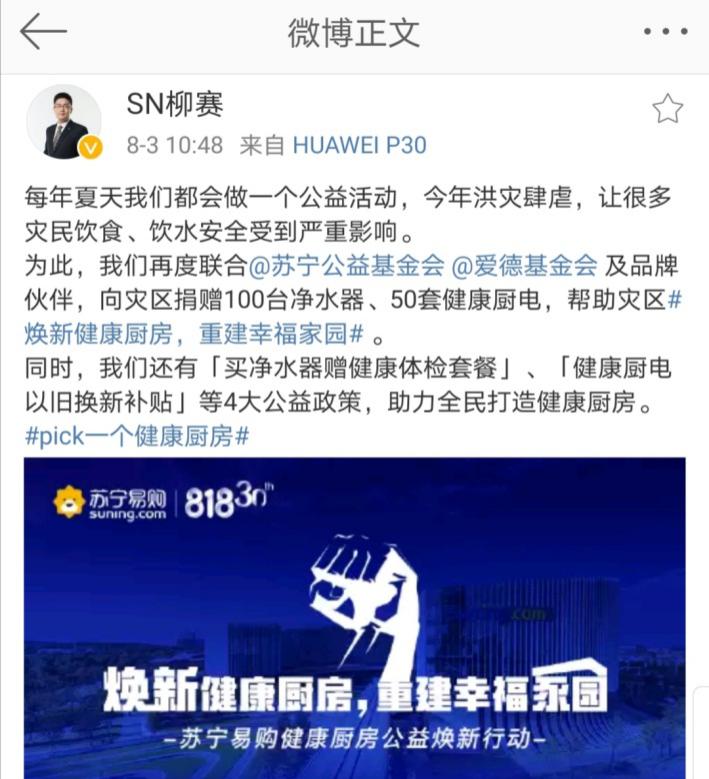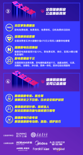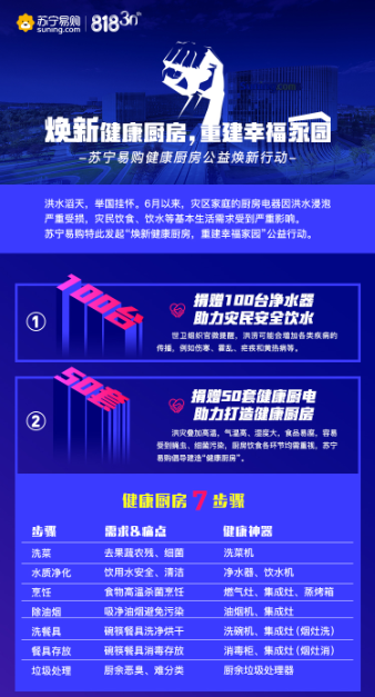 昨日,蘇寧繼發(fā)布“戰(zhàn)汛六條”后,又聯(lián)合蘇寧公益、愛德基金會及老板電器、美的、A.O.史密斯、安吉爾、法迪歐、惠而浦等各大品牌,發(fā)起“煥新健康廚房,重建幸福家園”公益活動,面向?yàn)?zāi)區(qū)送出100臺凈水器、50套健康廚電,并向全民推出四大公益福利政策。