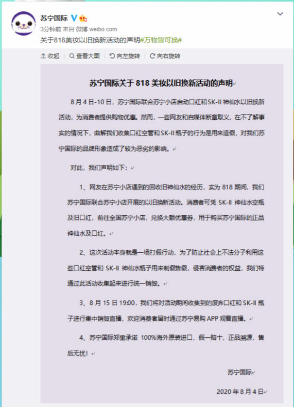 “我們的活動(dòng),原本是為了防止社會(huì)上不法分子,利用這些口紅空管和神仙水瓶子用來制假售假,侵害消費(fèi)者的權(quán)益,沒想到會(huì)被部分網(wǎng)友曲解。希望消費(fèi)者都能理性思考,獨(dú)立判斷,勿信謠傳謠。”蘇寧國際相關(guān)負(fù)責(zé)人表示。