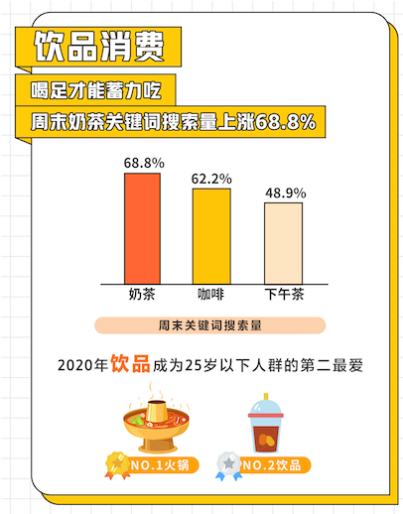 周末餐飲消費(fèi)中,在美團(tuán)點評,周末奶茶、咖啡關(guān)鍵詞搜索量上漲均超過60%,飲品更是成為25歲以下人群除火鍋之外的“心頭好”。
