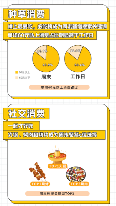 跟著榜單種草、拔草的“種草消費(fèi)”成為周末消費(fèi)的重要特點之一。美團(tuán)6-7月數(shù)據(jù)顯示,“必吃榜”成為周末新增熱搜關(guān)鍵詞,且6-7月周末單均60元以上消費(fèi)占比達(dá)63.9%,明顯高于工作日的60.4%。