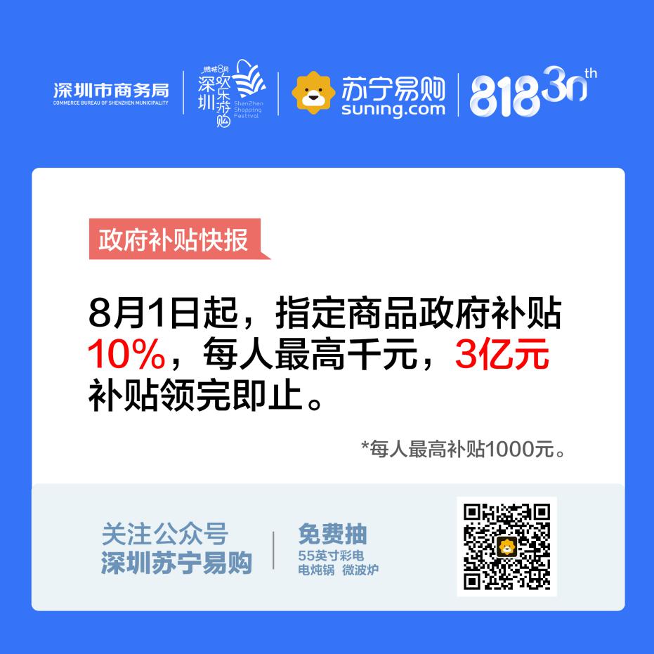 第二屆鵬城八月歡樂(lè)游購(gòu)——深圳家電數(shù)碼消費(fèi)節(jié)在華強(qiáng)北群星廣場(chǎng)自8月1日起拉開(kāi)帷幕,已向深圳居民推出3億元家電和數(shù)碼產(chǎn)品補(bǔ)貼政策,用戶(hù)按實(shí)際購(gòu)買(mǎi)價(jià)格的10%給予補(bǔ)貼,每位居民累計(jì)最高補(bǔ)貼1000元?;浉厶K寧電器店及家樂(lè)福與大潤(rùn)發(fā)近3000件商品均可享用。品類(lèi)覆蓋齊全,商品選擇范圍廣,為消費(fèi)者帶來(lái)一場(chǎng)盛大家電數(shù)碼消費(fèi)節(jié)的同時(shí)為經(jīng)濟(jì)消費(fèi)做出強(qiáng)有力的貢獻(xiàn)。