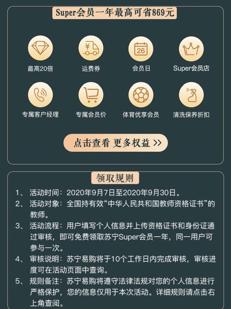 9月7至9月30日,凡持有效“中華人民共和國教師資格證書”的老師,在蘇寧易購AP P上搜索“教師”,進入 Super會員領取頁面,填寫個人信息并上傳資格證書和身份證。通過審核后,即可免費領取蘇寧Super會員年卡一張。