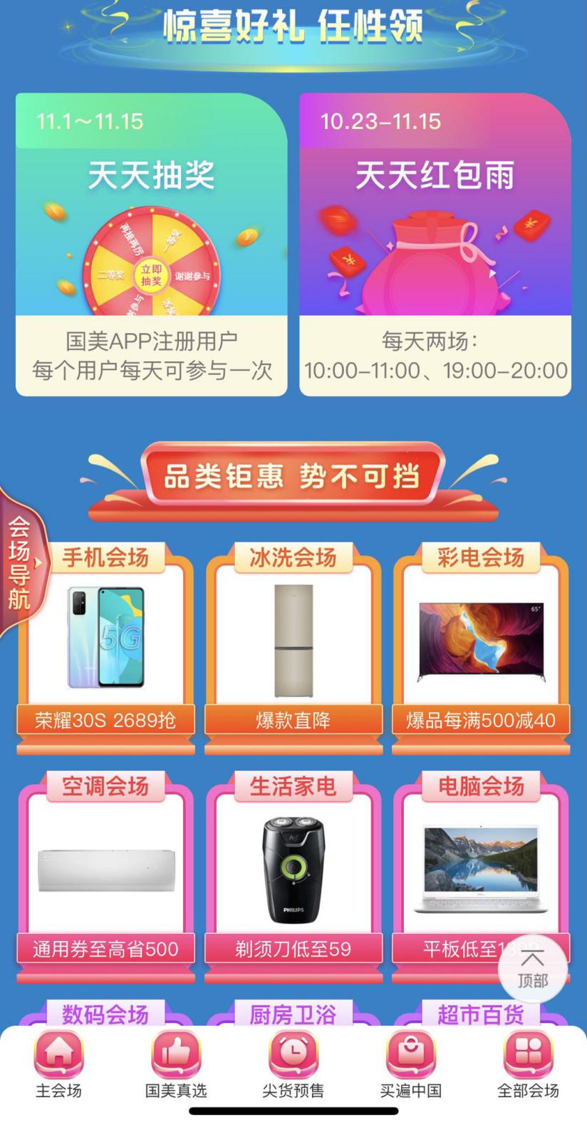 見圳客戶端·深圳新聞網(wǎng)2020年10月29日訊 轉(zhuǎn)眼已經(jīng)到了十月末,11.11狂歡浪潮已然襲來!從本周開始,各大平臺(tái)已經(jīng)開啟購物狂歡。本次國美“11.11”大促活動(dòng)時(shí)間由10月23日開始,一直持續(xù)到11月15日,整個(gè)狂歡節(jié)全程囊括了“國美真選”、“九九會(huì)員”、“買遍中國超級(jí)直播”、“飛天茅臺(tái)酒”等眾多板塊活動(dòng)內(nèi)容。另外,還有每日簽到、抽獎(jiǎng)、紅包雨、拼購等互動(dòng)搶福利玩法,一大波好物好玩等你圍觀,絕對(duì)滿足你薅羊毛、低價(jià)搶好物的期待。今年如何玩轉(zhuǎn)11.11?給您安排上!