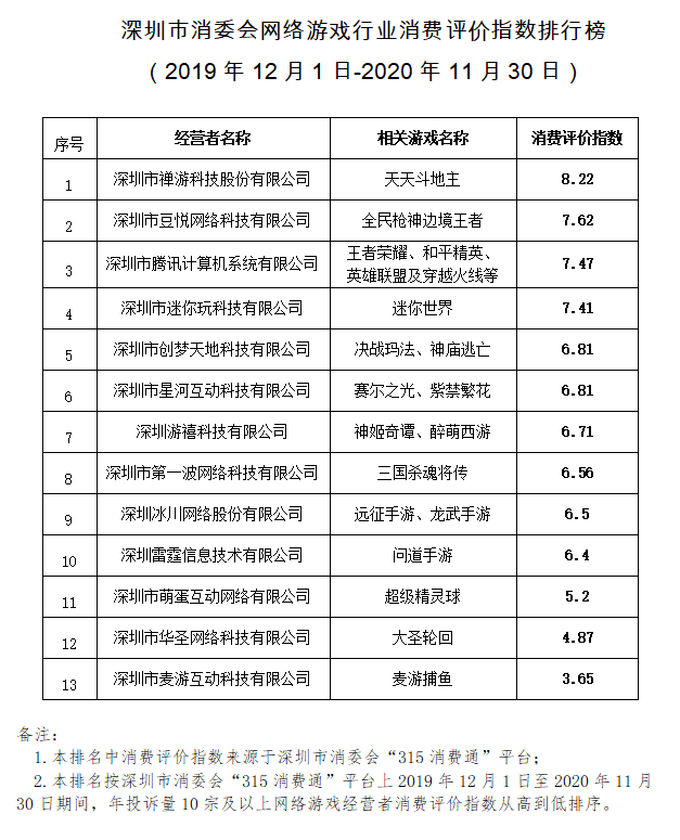 為推進(jìn)網(wǎng)絡(luò)游戲消費(fèi)者權(quán)益保護(hù)工作,促進(jìn)網(wǎng)絡(luò)游戲行業(yè)規(guī)范發(fā)展,引導(dǎo)放心消費(fèi),深圳市消委會(huì)依據(jù)2019年12月1日至2020年11月30日期間的相關(guān)數(shù)據(jù),對(duì)注冊(cè)所在地為深圳的年投訴量10宗及以上的13家網(wǎng)絡(luò)游戲經(jīng)營(yíng)者進(jìn)行消費(fèi)評(píng)價(jià)指數(shù)排名。