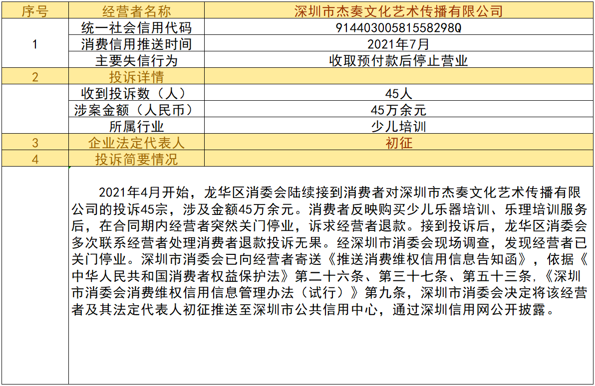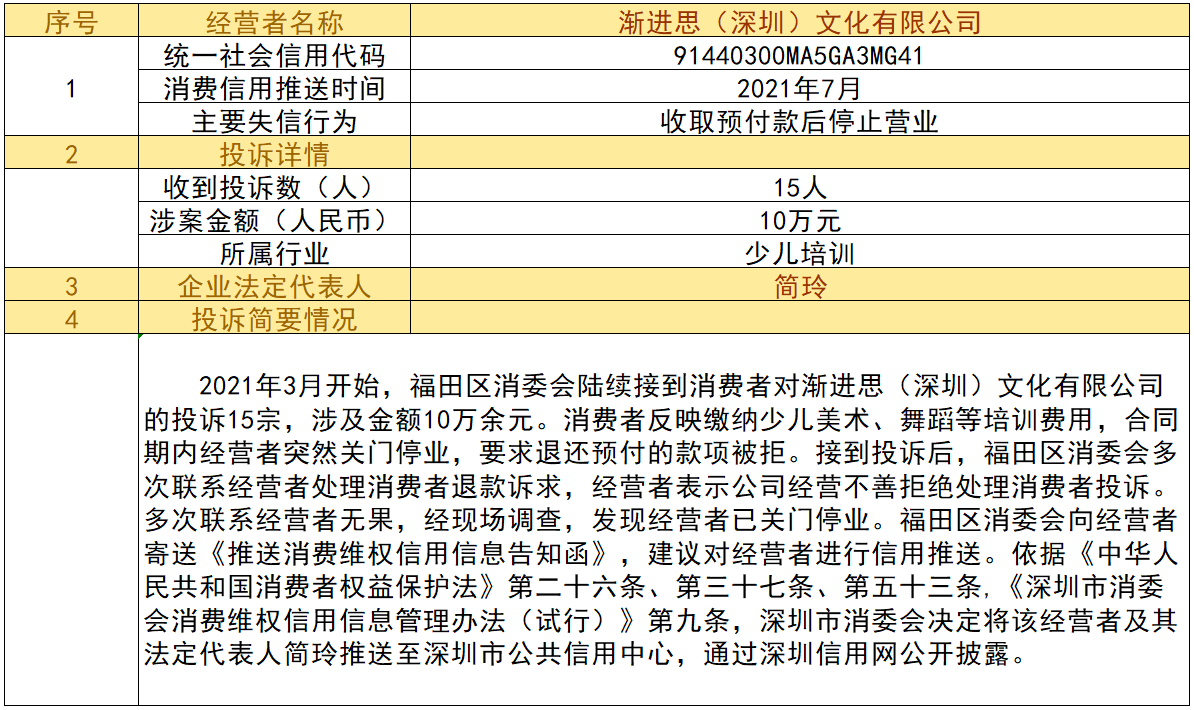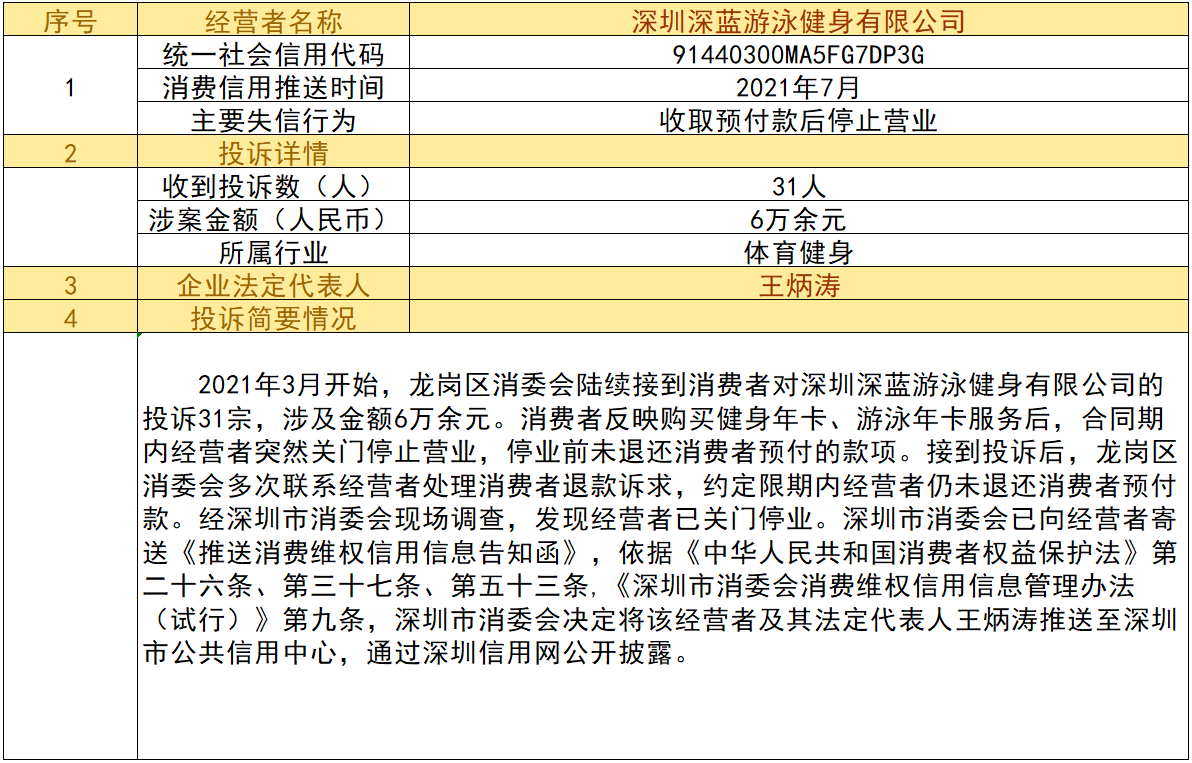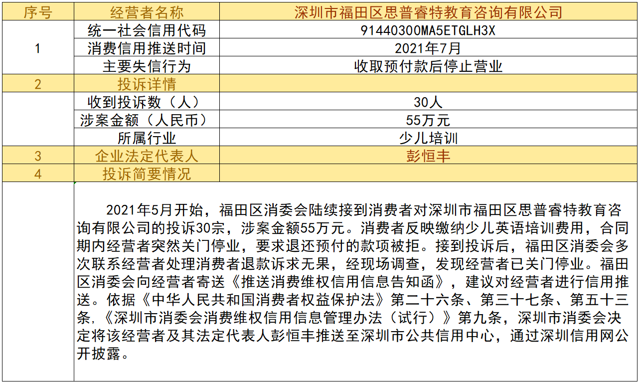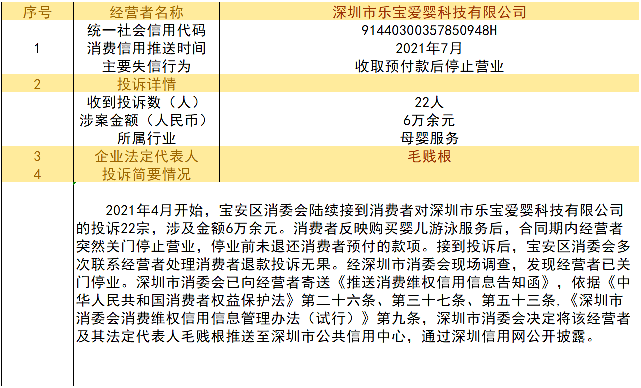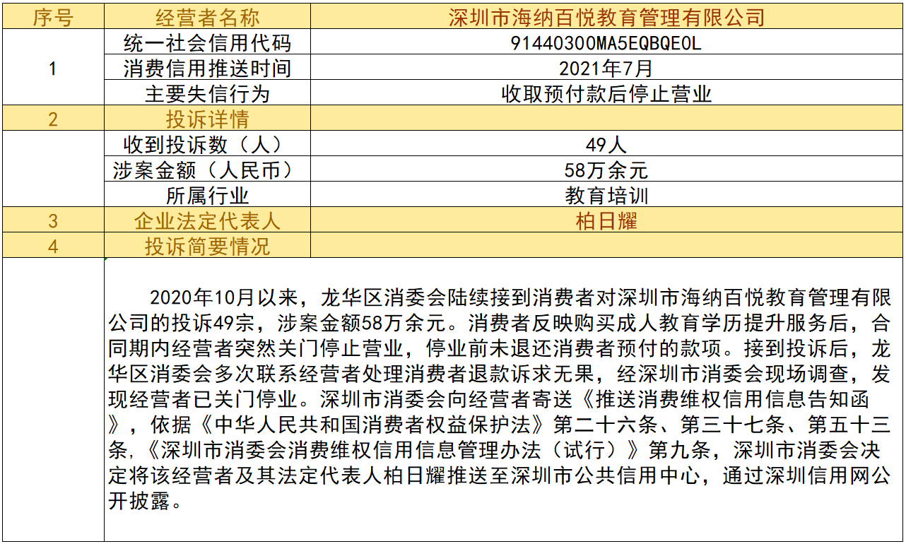 近日,深圳市消委會(huì)將九家“跑路”、未按約定退還消費(fèi)者預(yù)付款項(xiàng)的經(jīng)營(yíng)者及其主要負(fù)責(zé)人推送至深圳市公共信用中心,失信經(jīng)營(yíng)者信息信息將通過(guò)深圳信用網(wǎng)公開(kāi)披露。