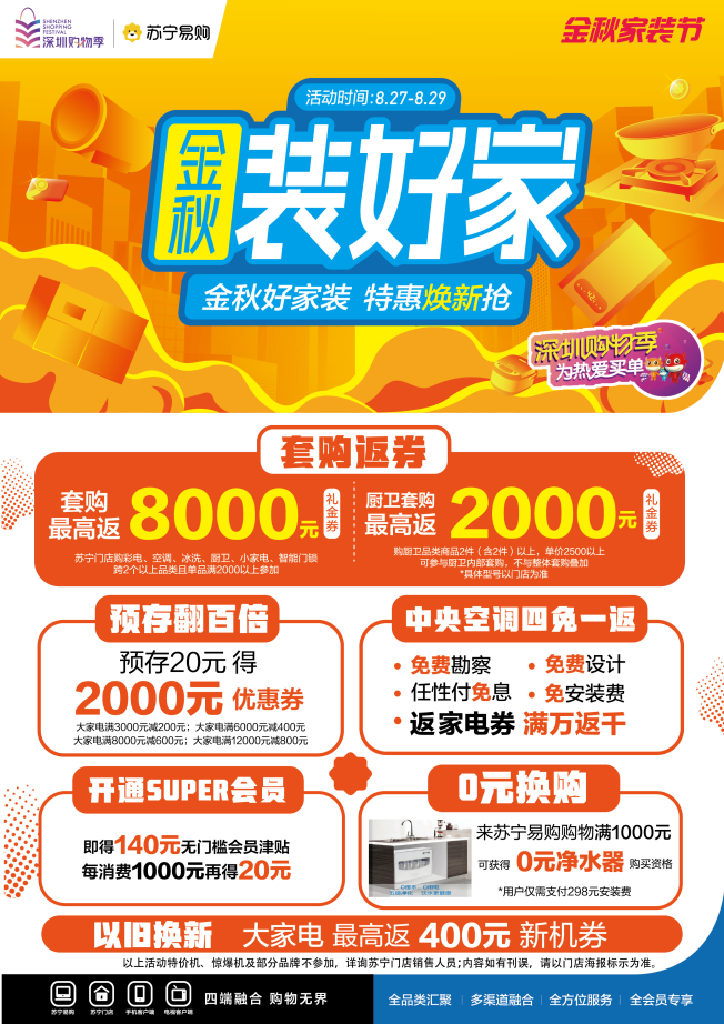 為了解決業(yè)主們的家裝問(wèn)題,蘇寧易購(gòu)于8月27日至8月29日啟動(dòng)廚衛(wèi)·金秋家裝節(jié),為近期需要對(duì)廚房進(jìn)行改造的業(yè)主,或是剛收新房的新業(yè)主,提供專業(yè)的廚衛(wèi)設(shè)計(jì)以及合適的廚衛(wèi)產(chǎn)品推薦;并且在活動(dòng)期間,來(lái)蘇寧易購(gòu)門店,購(gòu)買兩件以上廚衛(wèi)產(chǎn)品,且單價(jià)在2500元以上,即可參與廚衛(wèi)套購(gòu)活動(dòng),最高返2000元禮金券,還有以舊換新補(bǔ)貼以及0元換購(gòu)活動(dòng),來(lái)門店購(gòu)買如 A.O.史密斯等廚衛(wèi)產(chǎn)品,滿1000元即可0元換購(gòu)凈水器,消費(fèi)者僅需支付298元的安裝費(fèi)。并且凡在8月27日至9月12日間在蘇寧易購(gòu)門店購(gòu)買方太、老板、美的、 COLMO、西門子品牌的洗碗機(jī),消費(fèi)者將免費(fèi)獲得櫥柜局部升級(jí)改造活動(dòng)。