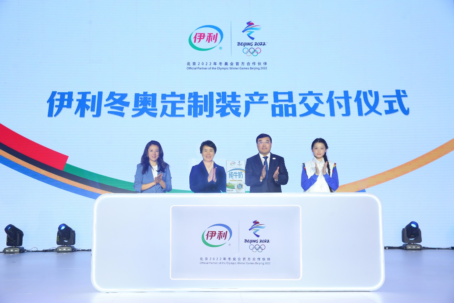 從左到右依次是:北京冬奧組委運(yùn)動(dòng)員委員會(huì)主席楊揚(yáng),北京冬奧組委專職副主席、秘書長韓子榮,伊利集團(tuán)董事長、總裁潘剛,伊利冬奧志愿團(tuán)形象大使