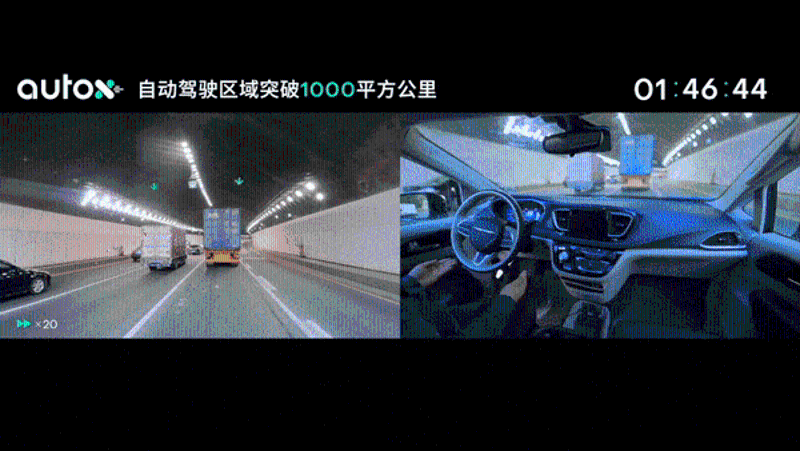 此外,無(wú)人車(chē)還穿越了長(zhǎng)達(dá)2.3公里隧道。在1小時(shí)46秒進(jìn)入隧道后,AutoX無(wú)人車(chē)始終保持50-60公里高速時(shí)速,連續(xù)穿越三個(gè)隧道,最終平穩(wěn)駛出,定位算法輕松應(yīng)對(duì)數(shù)公里長(zhǎng)的隧道。