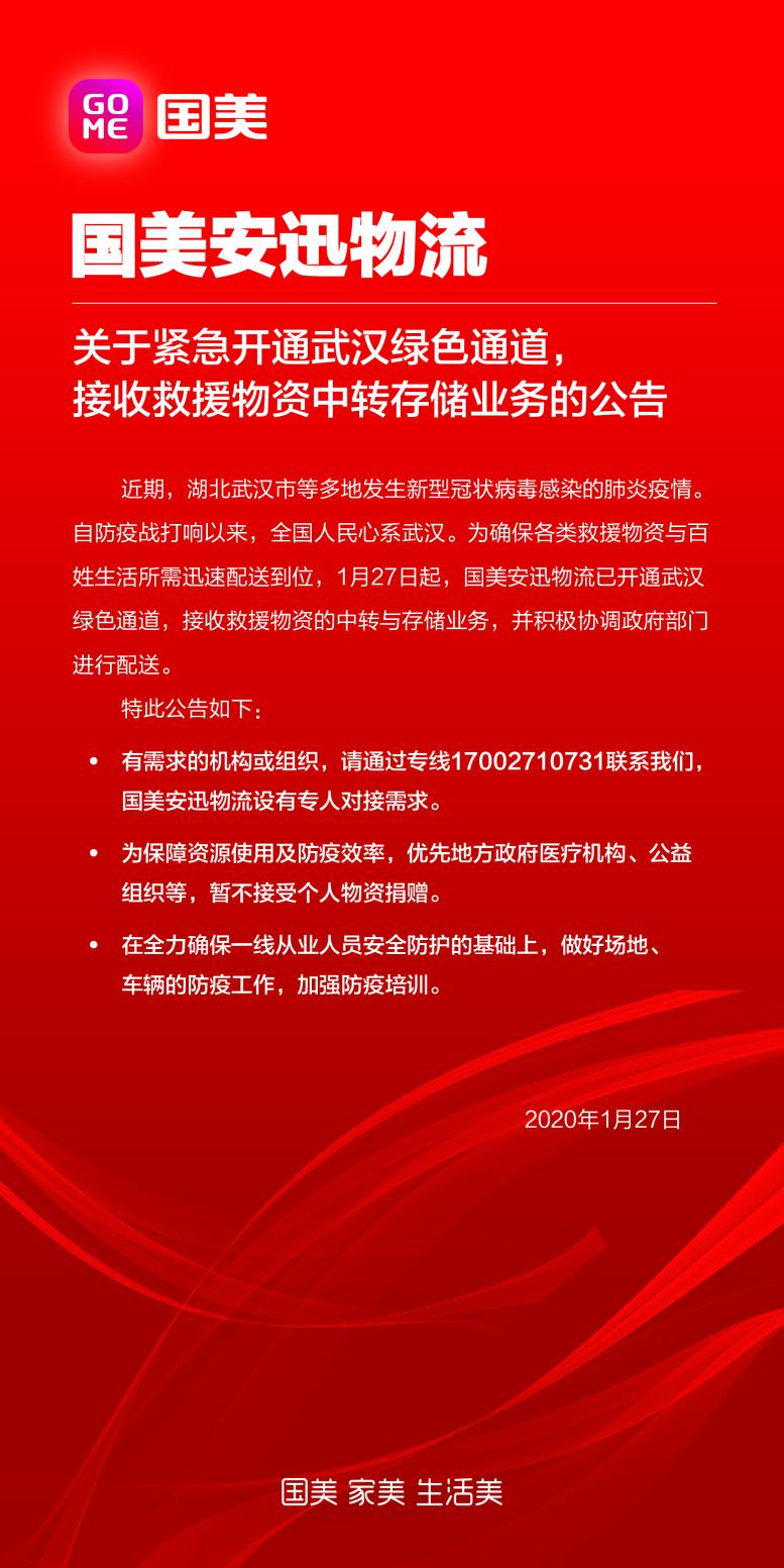 國美安迅物流宣布,即日起開通武漢綠色通道,接收救援物資中轉(zhuǎn)與存儲(chǔ)業(yè)務(wù),并積極協(xié)調(diào)政府部門進(jìn)行配送,全力保障疫情防控物資運(yùn)輸。