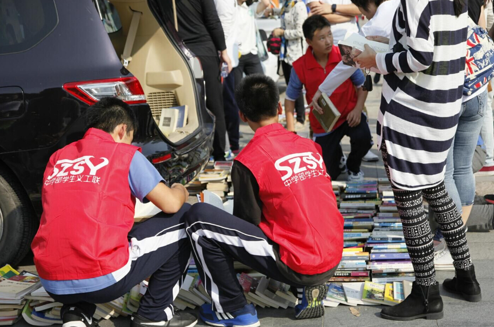 深圳市實(shí)驗(yàn)中學(xué)的車尾箱展位前圍滿了前來(lái)?yè)Q書的人