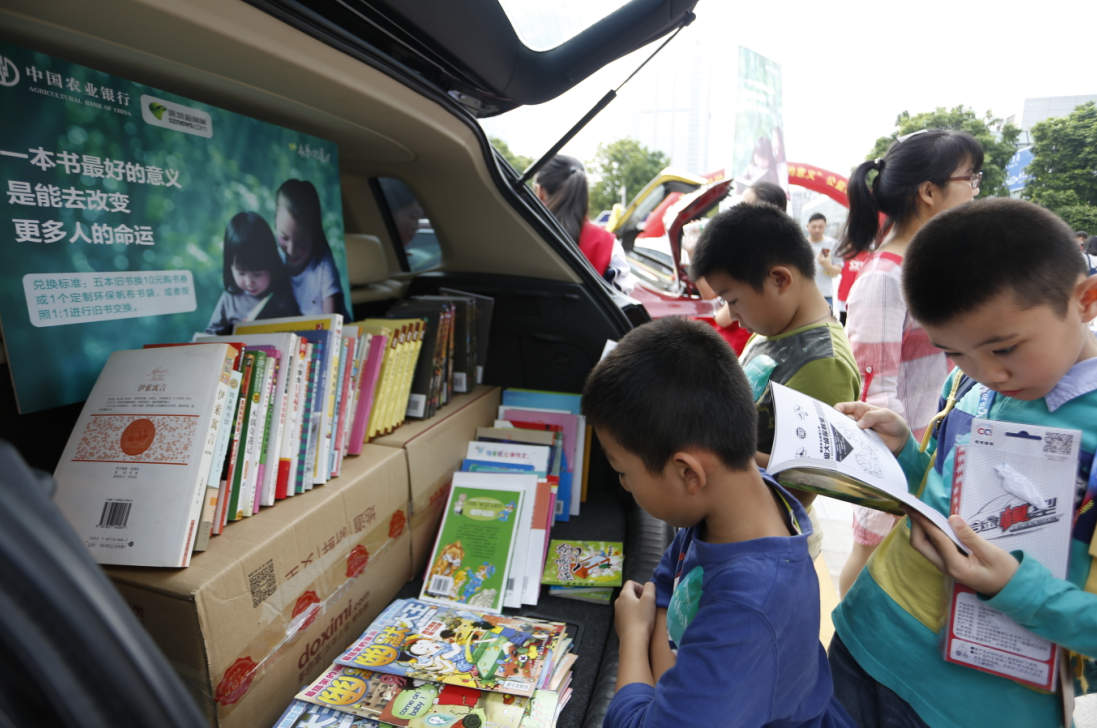 本次活動將車尾箱作為展臺,活動參與者按照1:1進(jìn)行舊書交換,或到深圳農(nóng)行現(xiàn)場設(shè)置的捐書點(diǎn)捐獻(xiàn)舊書,每捐出五本舊書,可獲得由農(nóng)行送出的10元書劵?;顒游齺碜藻\田小學(xué)、深圳實(shí)驗(yàn)學(xué)校中學(xué)部及深圳新聞網(wǎng)網(wǎng)友共40多個家庭參與,僅兩個小時(shí)便交出漂亮的“成績單”,現(xiàn)場交換圖書900多本,捐贈愛心書籍1000余本。