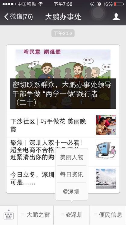 截止到11月7日,大鵬新區(qū)已有大鵬先鋒、大鵬新區(qū)社區(qū)家園網(wǎng)、大鵬公共事業(yè)、筑夢(mèng)大鵬、、大鵬辦事處等多家政府官方微信公眾號(hào)入駐了@深圳。