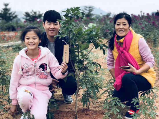 賞完了美景,是我們小記者今天最重要的活動了,由自己命名的栽植黃皮樹。我選了一棵特別漂亮的黃皮樹,挖好坑,施上肥,我把黃皮樹輕輕地放在坑里,填滿了土,澆上水,和它合了個美麗的靚影!