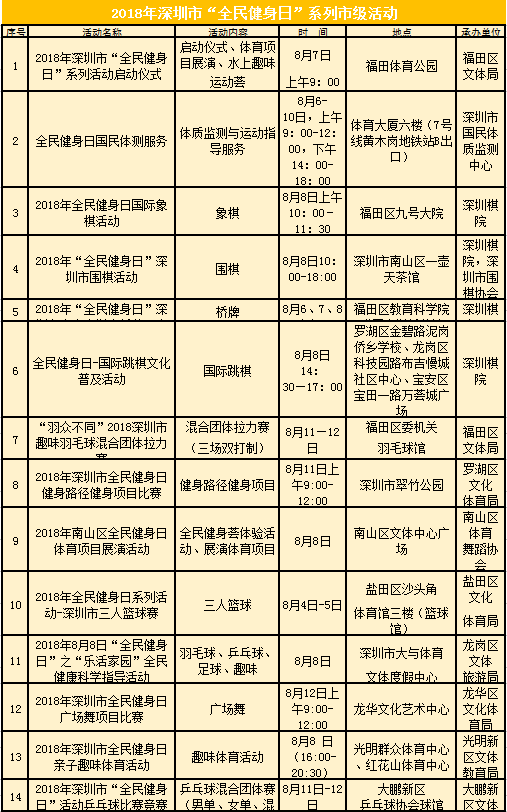 ????為方便更多群眾加入全民健身隊列,在今年的“全民健身日”,深圳市文體旅游局將在8月4日至12日,在全市開展全民組織開展,其中市級活動14項,各區(qū)也將因地制宜對活動進行時空拓展。下表為14大市級活動詳情。