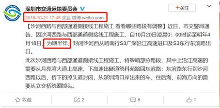 據市交委于2016年10月21日發(fā)布的通告稱,沙河西路與西部通道側接線工程(即東濱路隧道匝道工程)的施工時間計劃為2016年10月20日凌晨0:00時起至2017年4月18日,為期半年。期間將封閉沙河西從路南行s3廣深沿江高速進口及s3東行東濱路出口。