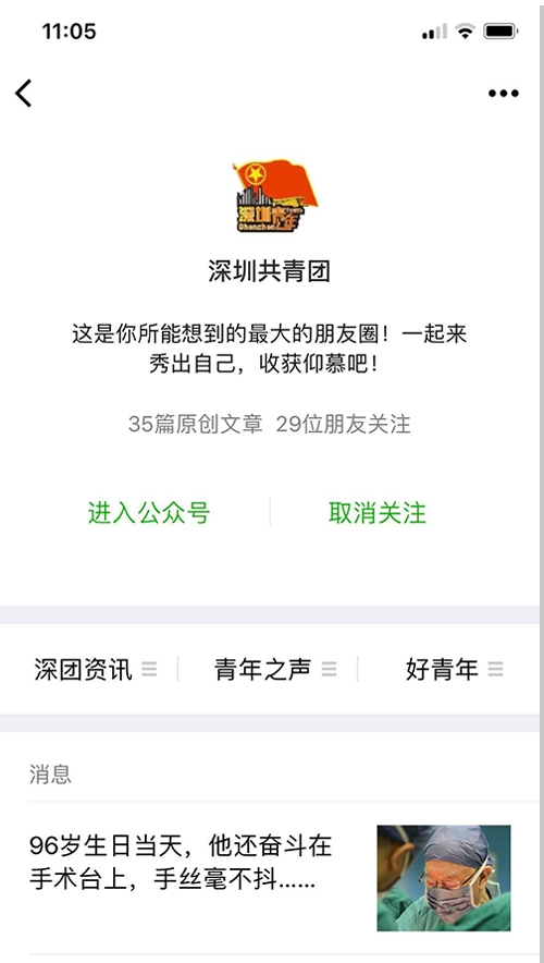 案例介紹:“深圳共青團(tuán)”微信公眾號于2013年開通,是全省最早開通的政務(wù)微信號。在近兩年加大力度建設(shè)和推廣后,粉絲數(shù)有了飛躍性的增長,推送閱讀量和影響力也有了比較明顯的提升。截至目前,累計推送1700余篇,平均閱讀量1萬以上,單篇最高閱讀量達(dá)到36萬,粉絲數(shù)90余萬。目前,公眾號影響力在全國地市級團(tuán)委中排名前3,在全市政務(wù)新媒體中排名前5。在發(fā)布的內(nèi)容上,主要關(guān)注時政要聞、社會熱點(diǎn)、政策解讀等與青年息息相關(guān)、喜聞樂見的話題內(nèi)容,弘揚(yáng)愛國精神和時代精神,是深圳共青團(tuán)聯(lián)系、引導(dǎo)和服務(wù)青年的重要載體。