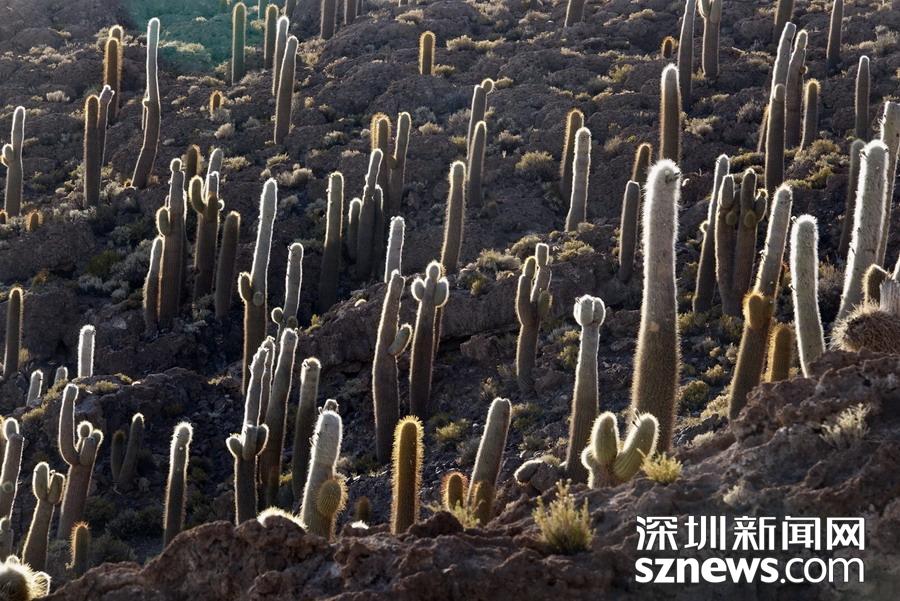 烏尤尼鹽沼在玻利維亞波托西省西部高原內(nèi),在鹽沼中央附近有一個名為魚島(從遠處看,此島像一條魚的形狀故名)的小島,上面長滿了仙人柱。李仁奇 攝
