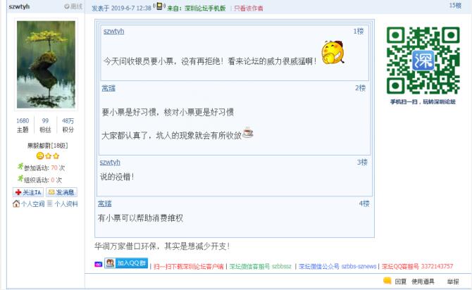 記者從問政平臺得知,5月底以來,還有市民發(fā)帖反映,除華潤萬家外,科技園萬象天地華潤Ole、僑香路沃爾瑪?shù)瘸幸泊嬖诓惶峁┘堎|(zhì)購物小票的情況。目前,市民仍然普遍認同超市應主動提供紙質(zhì)購物小票,避免顧客被價格欺詐。有市民表示:“遇到最多的是優(yōu)惠打折,實際還是原價買單,這時,手中有小票一目了然,不花冤枉錢?!边€有市民質(zhì)疑,“奸商,動不動就打著環(huán)保這些高大上的理由作借口”。同時,也有市民體驗過微信小票后表示,“沃爾瑪手機掃碼付款是沒有紙票,購物小票藏在微信公眾號里,退換貨就在那里面進行。這就是科技發(fā)達帶來的豐碩成果,挺好的?!苯刂劣浾甙l(fā)稿時,市民關于科技園萬象天地華潤Ole、僑香路沃爾瑪?shù)瘸胁惶峁┵徫镄∑钡奶倪€沒有得到相關部門回應。