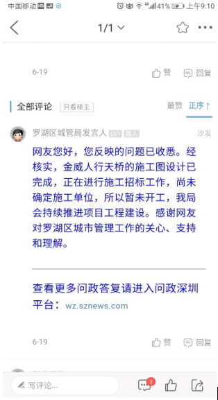 6月19日,羅湖區(qū)城管局表示“施工圖設計已完成,正在進行施工招標工作”。7月24日,該市民回帖詢問招標是否已有結(jié)果,表示“依然沒見工程隊施工”。